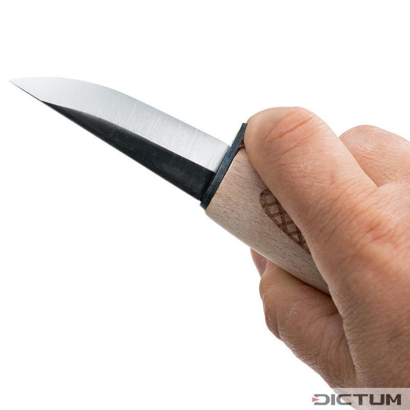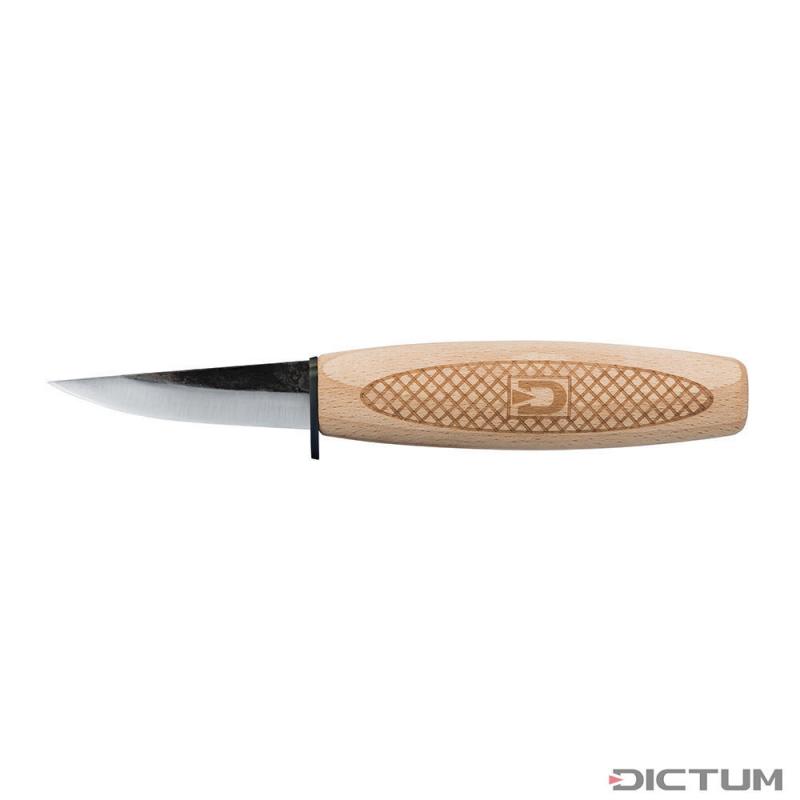 Sicherheit und Präzision stehen beim Schnitzen an erster Stelle, genau dafür ist unser Schnitzmesser mit Parierstück entwickelt worden. Das integrierte Parierstück dient als Schutzbarriere zwischen Ihrer Hand und der Klinge, wodurch das Risiko von Schnittverletzungen deutlich reduziert wird. Diese zusätzliche Sicherheitsmaßnahme ermöglicht es Ihnen, sich voll und ganz auf Ihre Kreativität zu konzentrieren. Dank seiner kompakten Klingenlänge eignet es sich perfekt für präzise Schnitzarbeiten, Detailarbeiten und feine Konturen. Nicht zuletzt ist unser Schnitzmesser auch ideal für den schulischen Einsatz geeignet. Seine benutzerfreundliche Konstruktion und sichere Handhabung machen es zu einem perfekten Werkzeug für Schülerinnen und Schüler, die ihre handwerklichen Fähigkeiten entwickeln möchten. Lieferung inkl. Schneidenschutz aus Rindsleder. DICTUM Schnitz- und Schälmesser, Form B/L, BS/L, BS/K, G/K, AB und AL DICTUM Schnitz- und Schälmesser überzeugen durch ihre Schärfe, Schnitthaltigkeit und einer hervorragenden Haptik. Die Klingen aus finnischem Kohlenstoffstahl 80CrV2 enthalten geringe Chrom- und Vanadiumbestandteile (Karbidbilder) und ermöglichen somit eine ausgezeichnete Standzeit bei gleichzeitig feinkörnigem Stahlgefüge. Als Korrosionsschutz wurde die Schmiedehaut an den Klingen erhalten. In Deutschland gefertigte Buchenholzgriffe mit rautenförmig geriffelter Oberfläche verleihen einen perfekten Grip und machen das Messer sicher in der Anwendung. Der ideale Schnittwinkel liegt – je nachdem, ob mit Weich- oder Hartholz gearbeitet wird – zwischen 20 und 27. Je spitzer der Winkel, desto besser schneidet das Messer. Je stumpfer der Winkel, desto länger ist die Standzeit z. B. in Hartholz. Die DICTUM Schnitzmesser liegen selbst nach einem Mikrofasenschliff (durch den Anwender) noch im optimalen Schnittwinkelbereich.