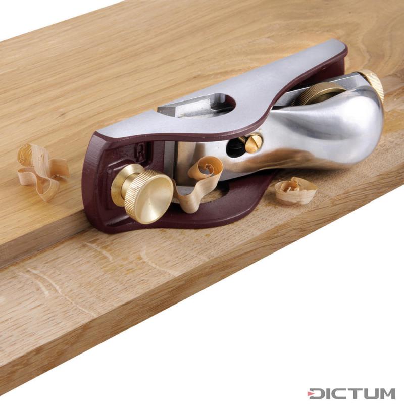 Für das Bearbeiten von Fälzen und Brüstungen und das Nacharbeiten von Zapfen. Auch Hirnholz kann durch den niedrigen Neigungswinkel (12) bestoßen werden. Fasenwinkel 25. Daraus resultiert ein Schnittwinkel von 37. Leichtgängige Eisenfeinjustierung, Maul nicht verstellbar. Lieferung inklusive Hobelsäckchen aus Jute-Baumwoll-Mischung mit Zugband. DICTUM Hobel Die Entwicklung unserer DICTUM-Hobelserie erfolgt in Anlehnung an unsere Herdim-Hobel. Diese fertigen wir seit Jahrzehnten für unsere Geigenbauer, die höchsten Wert auf äußerste Präzision und perfekte Arbeiten legen. Solide, spannungsarm geglühte Hobelkörper aus Stahlguss, mit fein geläppten Sohlen und Wangen rechtwinklig zueinander abgerichtet, sprechen ebenso für Qualität wie die mindestens 3 mm dicken Eisen aus SK4-Stahl (61 HRC). Die Hobel sind optional auch mit einem japanischen Eisen aus Blauem Papierstahl (63 HRC) oder einem HSS Cryo Eisen (64 HRC) erhältlich. Die leicht zu justierende Eisenzustellung ermöglicht einfache Korrekturen, während ergonomisch geformte, in Tests entwickelte Griffe und polierte Klappen gut in der Hand liegen. Griffe aus heimischem Rotbuchenholz. sofern nicht anders angegeben