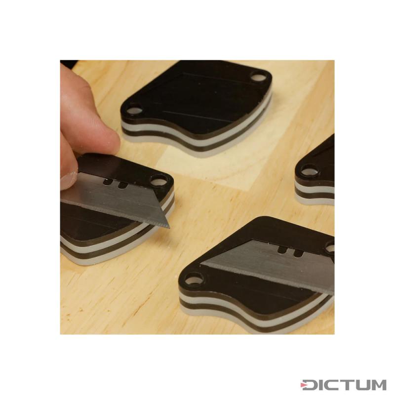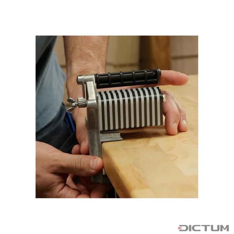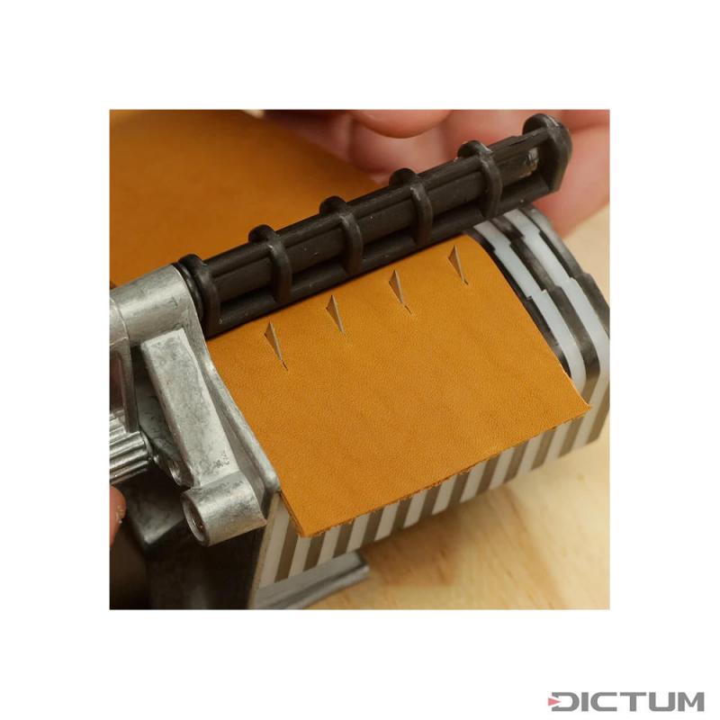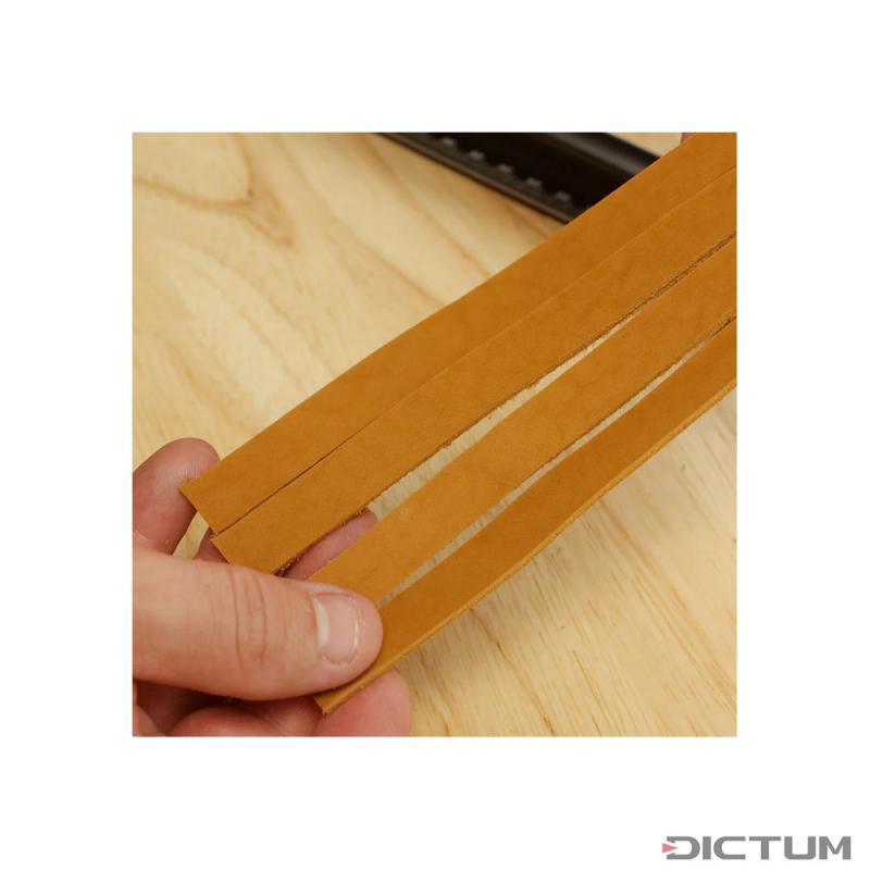 Robuster Flechtband- und Riemenschneider zur Montage an der Werkbank oder Tischplatte mit einer max. Stärke von 38 mm. Die 2 variablen Kunststoffeinsätze werden mit Cutter-Klingen (5 Stück inkl.) bestückt und können eine max. Lederdicke von 4 mm schneiden. Kunststoffeinsatz 1 Die Streifenbreite beträgt min. 2,3 mm oder ein Vielfaches davon (4,6, 6,9, 9,2, 11,5 mm, etc.) und ist frei wählbar. Die maximale Streifenbreite beträgt 78 mm. In diesen Einsatz können max. 23 Cutter-Klingen eingesetzt werden. Kunststoffeinsatz 2 Die Streifenbreite beträgt min. 4,0 mm oder ein Vielfaches davon (8, 12, 16, 20 mm, etc.) und ist frei wählbar. Die maximale Streifenbreite beträgt 72 mm. In diesen Einsatz können max. 16 Cutter-Klingen eingesetzt werden.